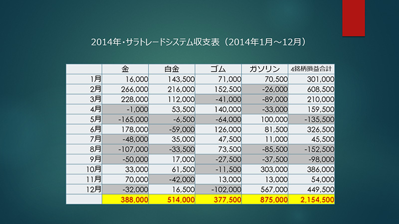 ですが、金、白金、ガソリン、ゴムの4銘柄をそれぞれ1枚ずつ運用し、